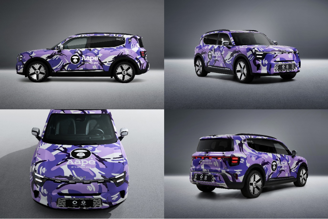 此番合作聚焦由梅赛德斯-奔驰全球设计团队倾力打造的smart#5车型,致敬其突破革新的设计理念与探索精神,AAPE以全新设计的紫色迷彩高调重塑smart#5外观,从车身到轮毂等细节处均注入两者品牌标识、标语等经典符号,释放气场全开的视觉张力。这部酷炫十足的潮流座驾,不仅象征着街头时尚文化与尖端汽车科技的完美融合,更以独特的叙事创意为各自领域激发更多的灵感与能量。