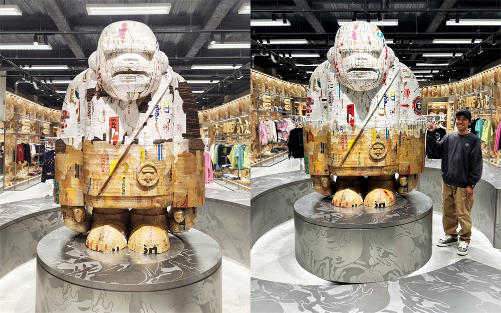 店中央矗立的AAPER 军团成员ALDO艺术雕塑作品,由日本艺术家仪间朝龙所匠心创作。这个作品采用来自全球各地的可回收纸板制作,不仅探索了环保理念的艺术表达,更象征着大阪心斋桥作为世界文化交流纽带的独特地位。仪间朝龙分享到:“我希望打造一件只属于这里的艺术品。虽然创作的过程充满挑战,但最终的成品真的很酷。”这件独一无二的艺术臻品,让AAPE心斋桥专门店成为让每一位时尚、艺术与文化爱好者必去的潮流目的地。