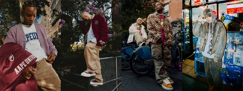 AAPE 2025秋冬男装系列通过三个鲜明主题,探索野心、自由与团结。「AAPE CHASING DREAMS」主题系列以1970年美国学院着装风格诠释坚韧意志;「AAPE STREET PULSE」主题系列以90年代怀旧风捕捉滑板文化的本真活力;「AAPE REBEL HEARTS」系列则糅合了军事风及爱与和平的理念。三个主题系列共同交织,颂扬无畏表达的街头精神。