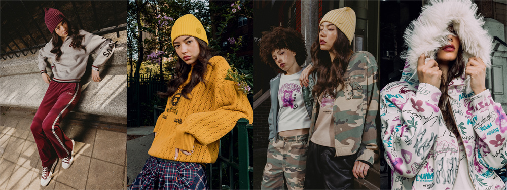 本季女装系列从两大设计主题出发:「AAPE COLLEGE」主题系列散发经久不衰的复古学院格调,由滑板与涂鸦文化衍生出的「AAPE SKATE」主题系列展现反叛不羁的个性底色,书写AAPE女孩百变多样的写意生活。拥抱无限创意,秋冬女装系列邀您走进以实用及潮流构筑的街头时装世界。